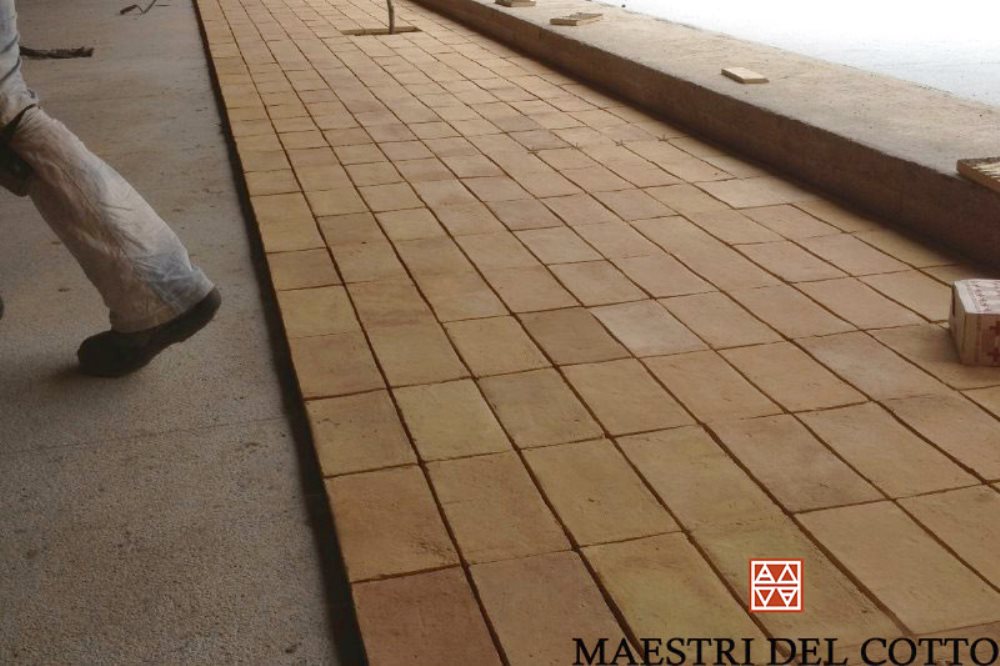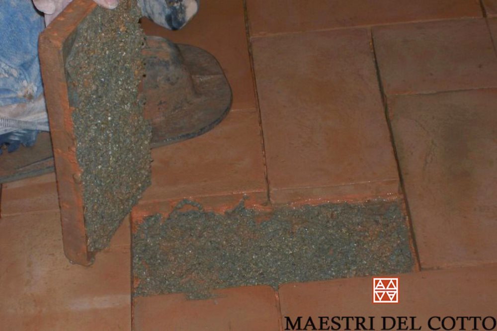 FUNZIONALE: Posare i manufatti su un letto di sabbia ci permette di posizionarli “accompagnando” meglio le difformità naturali e tipiche che caratterizzano un pavimento in cotto fatto a mano.