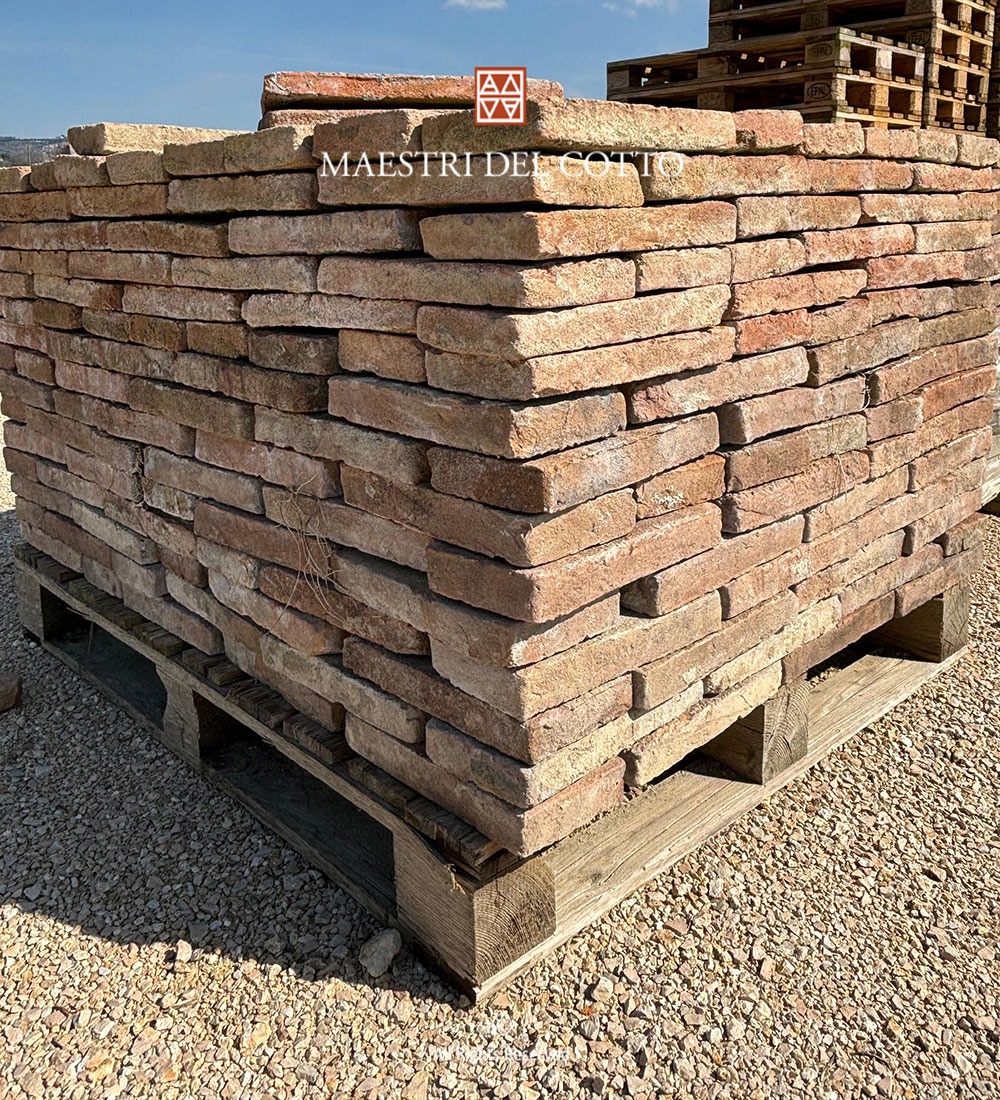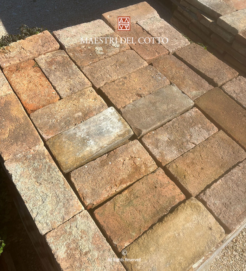 Mattoni antichi di recupero fatti a mano, attentamente selezionati e provenienti da demolizioni storiche italiane, che presentano quindi tutte le caratteristiche di un prodotto unico ed antico, eterogeneo nella forma e nel colore. Trattandosi di materiale di recupero, le misure dei formati sono da considerarsi orientative e potrebbero variare da un manufatto all'altro.