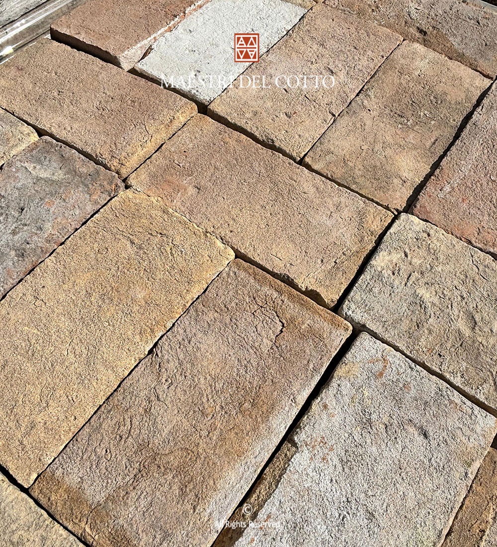 Cotto antico di recupero fatto a mano, attentamente selezionato, proveniente da demolizioni storiche italiane, che presenta quindi tutte le caratteristiche di un prodotto unico ed antico, eterogeneo nella forma e nel colore. Trattandosi di materiale di recupero, le misure dei formati sono da considerarsi orientative e potrebbero variare da un manufatto all'altro.