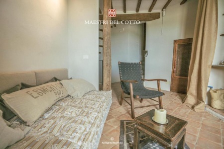 In queste camere il pavimento in cotto storico si integra perfettamente con il resto dell’arredo: tappeti tessuti artigianalmente, legno chiaro, tessuti naturali e finestre ampie che lasciano entrare la luce morbida della campagna. Si ha l’impressione di vivere in un ambiente autentico, senza rinunciare al comfort moderno, con un equilibrio che risulta davvero ben riuscito.