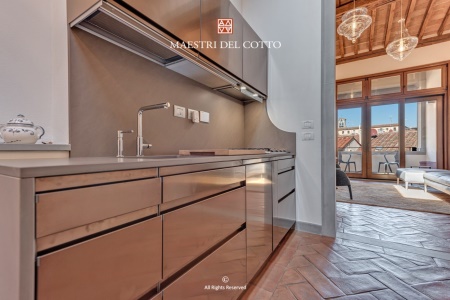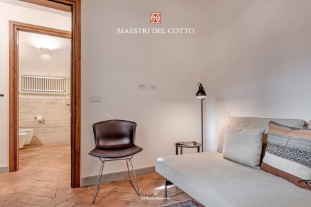 Una traccia presente sulla facciata del palazzo ha permesso ai tecnici di intraprendere il progetto di riapertura di una antica loggia. L'appartamento ha recuperato quindi la luminosità di cui aveva sicuramente bisogno, aiutato infine anche dalla scelta del nostro cotto rosato che, con le sue tenui sfumature, ha portato a segno l'obiettivo!