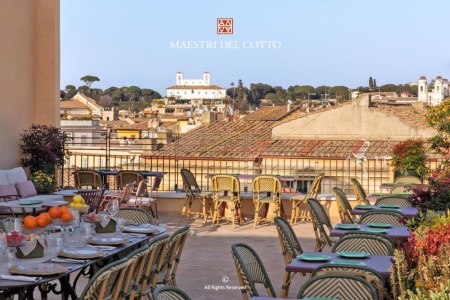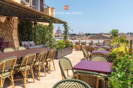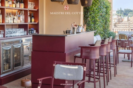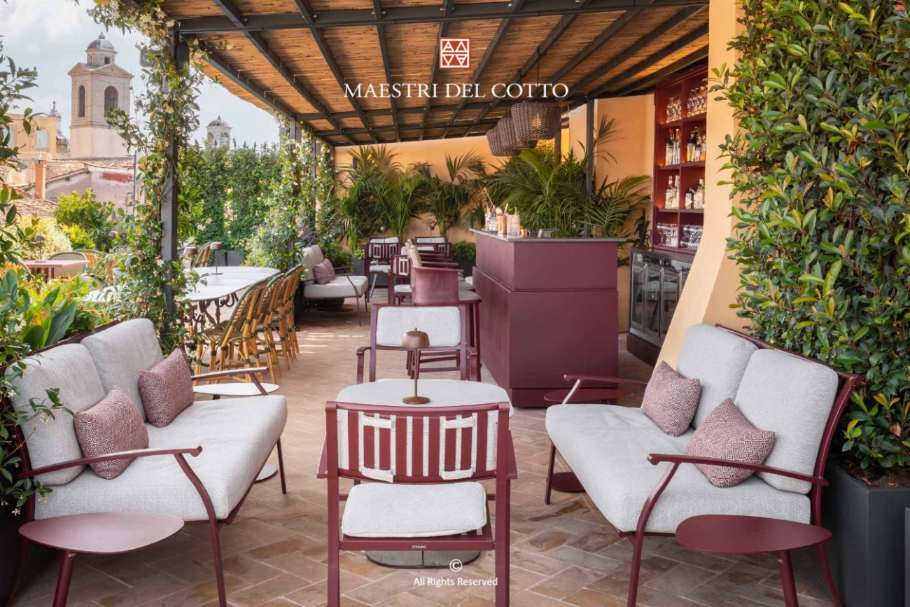 Nel rooftop, ad esempio, il cotto Terre Umbre naturale funge da base autentica: non è solo un rivestimento, è il suolo che racconta radici, richiami terreni, tradizioni dell’Italia centrale, incorniciato dallo skyline romano fatto di cupole, tetti, guglie. Camminando su questi pavimenti, ogni passo diventa sensazione e tutto ciò amplifica l’idea che ogni terrazza non sia un residuo, ma un ambiente da vivere, un frammento privilegiato della città che diventa un’estensione confortevole dell’hotel.