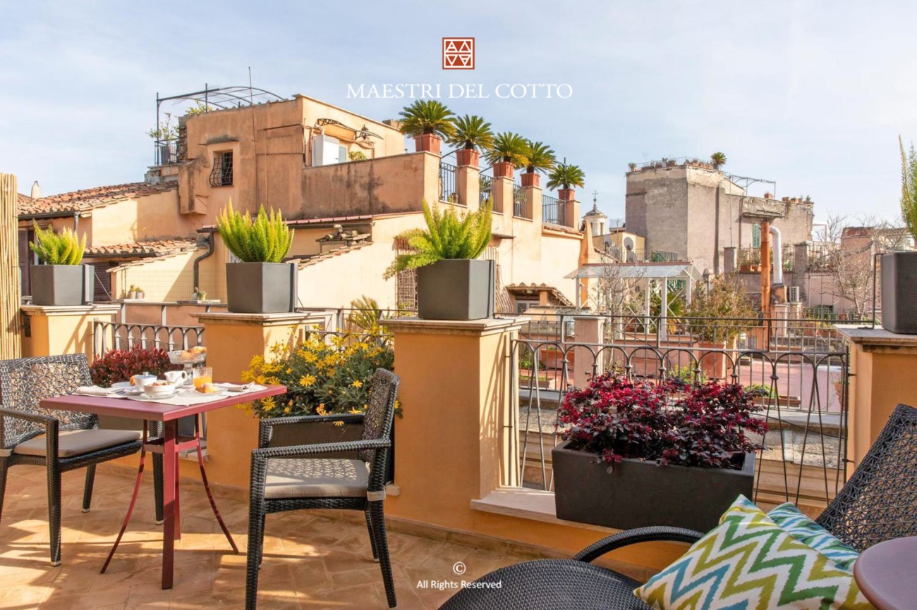 Le camere con terrazzo o balcone palesano come questi pavimenti trasformano spazi privati in piccole oasi. Niente di asettico o freddo: il cotto naturale invita a sedersi a un tavolino, a godere del primo caffè guardando i tetti di Roma, a fermarsi a contemplare il tramonto, a respirare l’aria serale filtrata da pietra, muro, cielo.