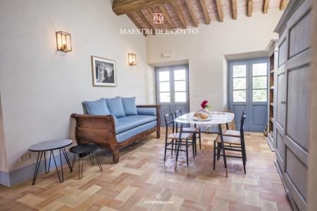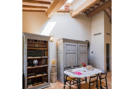La scelta del cotto multicolor non è stata casuale, ma profondamente coerente con la filosofia del Podere Gonzaga. È un materiale capace di resistere nel tempo, solido e affidabile come la terra che lo genera, e al tempo stesso elegante nella sua semplicità. È il segno tangibile di una continuità che unisce la fatica contadina di un tempo al piacere raffinato dell’ospitalità odierna. Quando la luce del tramonto si riflette sulle pianelle e i colori si intensificano, sembra che il pavimento stesso racconti la storia del podere, delle persone che lo hanno abitato e di quelle che oggi lo vivono con meraviglia.