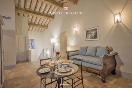 Camminare su questo pavimento significa entrare in sintonia con l’anima del luogo. Il cotto accoglie il passo con una sensazione calda e materica, assorbe la luce che filtra dalle finestre e la restituisce sotto forma di bagliori soffusi, creando atmosfere che cambiano di ora in ora. Nelle grandi stanze restaurate, le pianelle sembrano amplificare il racconto delle pareti in pietra e delle travi a vista, come se ogni superficie partecipasse a un unico respiro. Non c’è stanza che non ne venga valorizzata: nelle camere più colorate il pavimento si fa base neutra e accogliente, in quelle più sobrie dona vibrazione e carattere, nei saloni comuni diventa complice di momenti conviviali e intimi.