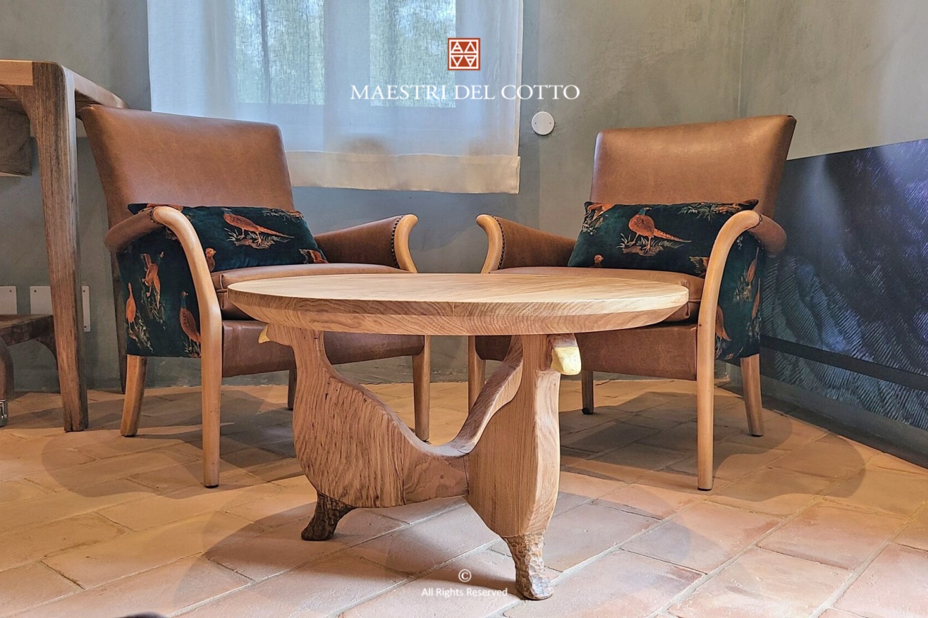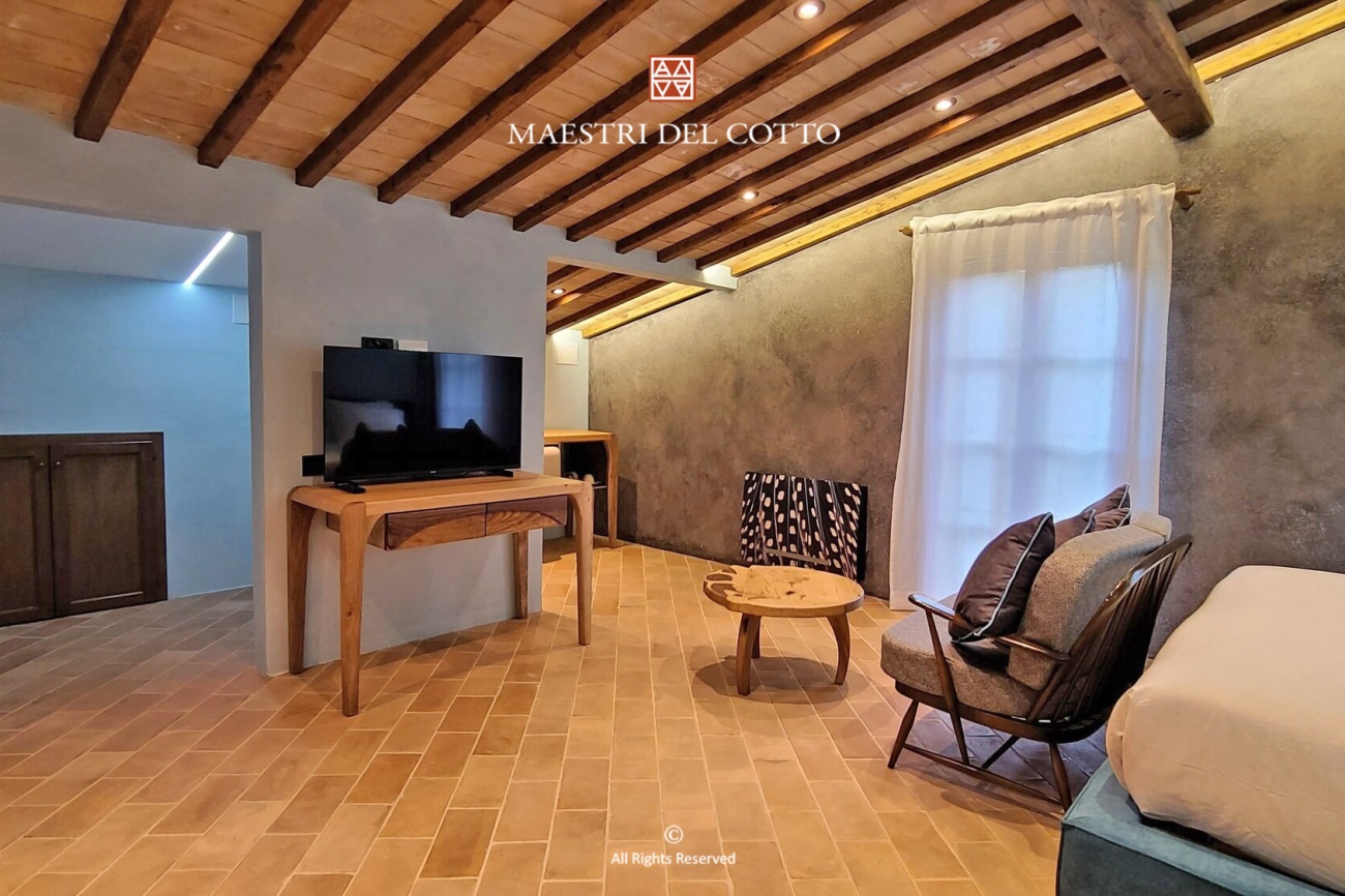Salendo le scale interne della Torre, mentre la luce filtra sottile dalle finestre in pietra, lo sguardo si alza e incontra il soffitto, dove le pianelle in cotto multicolor disegnano una trama viva tra le travi in legno. Sono elementi antichi nella tecnica, ma vibranti nel risultato: ogni pianella racconta una storia diversa, con sfumature che variano dal rosato tenue al bruno caldo, passando per toni ambrati e ombre più scure, frutto di una cottura a legna che lascia che il fuoco stesso imprima il suo segno. Nel sottotetto della Torre, queste pianelle non sono semplici finiture, ma parte integrante dell’esperienza sensoriale: restituiscono il calore di materiali naturali, il fascino dell’imperfetto, la bellezza del tempo che passa.