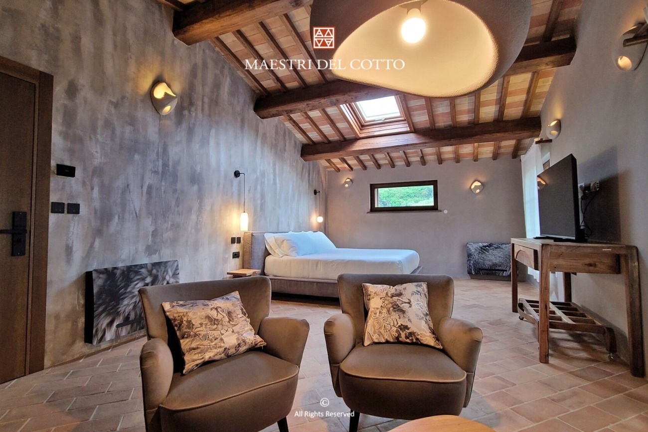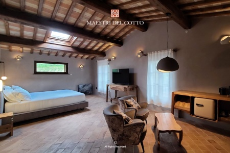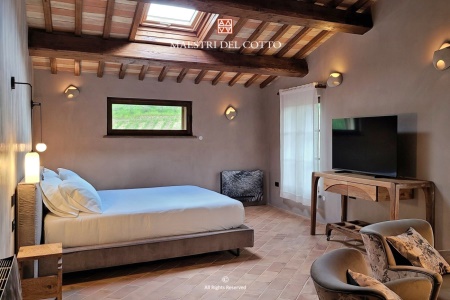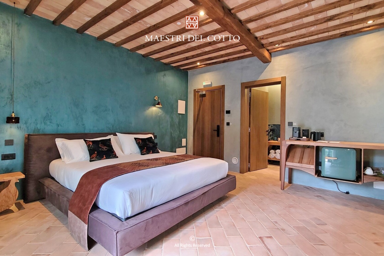 Le stanze, nobili e semplici insieme, respirano lo spirito della Toscana più vera. Ogni camera è concepita singolarmente, ispirata a un animale, un simbolo che riflette la fauna, la simbologia di queste terre. Il mosaico fatto a mano in ogni bagno è dettaglio prezioso, sorpresa artigianale che riprende geometrie antiche ma colloquia con il comfort contemporaneo: specchi riscaldati, riscaldamento a pavimento nei bagni, illuminazione pensata, minibar gratuito.