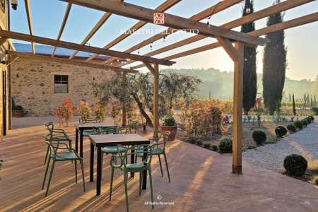 Camminando attraverso il cancello, la voce del vento tra gli olivi si fonde con il richiamo lontano delle colline. Sei ettari di vigneto abbandonato che oggi, cura dopo cura, hanno ripreso vigore; duecento olivi che ondeggiano al sole; diciotto arnie che mellificano l’aria con il profumo dolce del fiore, il ronzio leggero. La torre imponente si erge come guardiana della memoria, con muri spessi che raccontano epoche ormai svanite, aperture che inquadrano scorci su San Gimignano e sentieri che si perderanno fra le vigne.