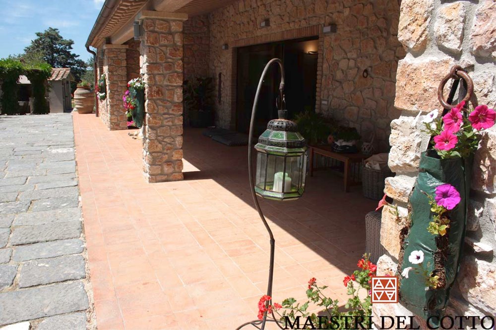 Per gli esterni abbiamo realizzato il portico in Cotto Antico Buttero Ingelivo, Antiscivolo, Antimuschio e Carrabile, che non necessita di trattamento.