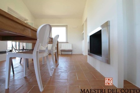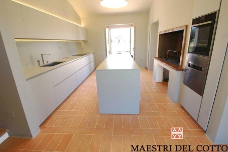 Il pavimento della cucina è realizzato con il nostro Cotto Terre Umbre, nel formato 15-30-2,5 cm, mentre gli altri sono di Cotto Rosso Vissuto.