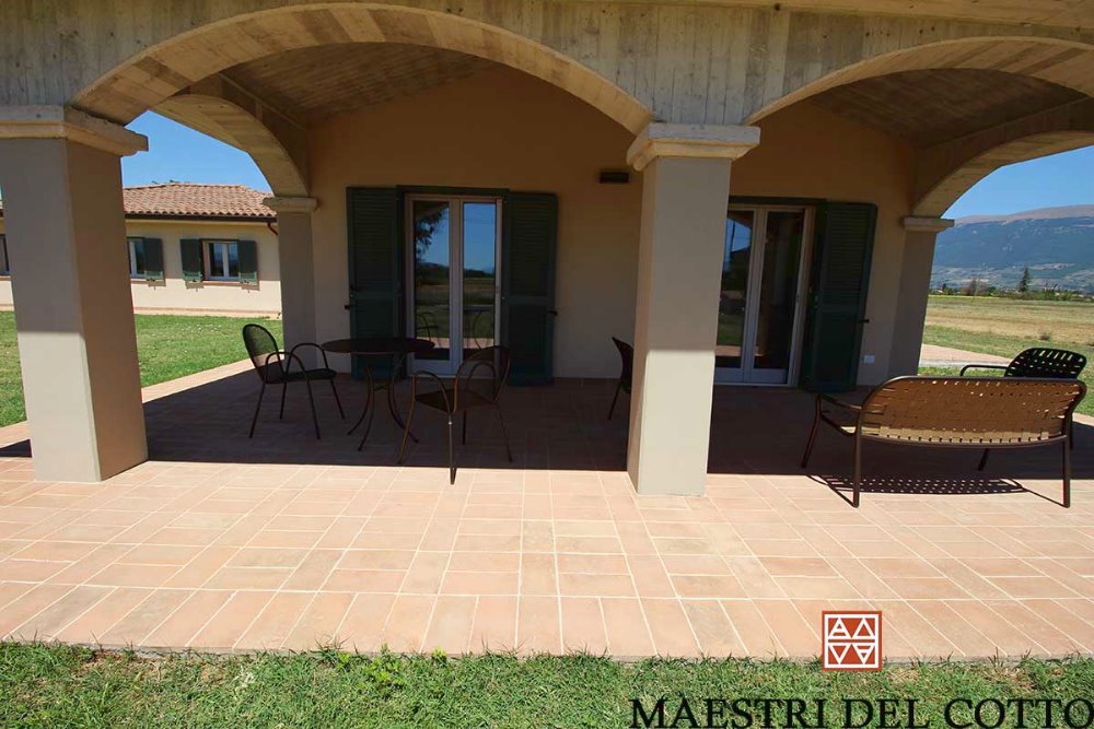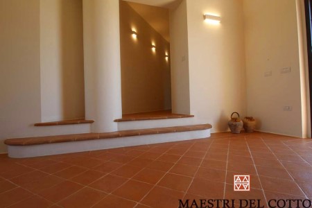 Per gli esterni, abbiamo ricoperto la superficie con il Cotto Rosato Toscano Vissuto, Ingelivo, Antimuschio, Antiscivolo e Carrabbile.