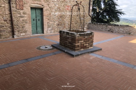 La scelta è ricaduta sul Cotto Rosso Firenze, nel classico formato della Pianella 15x30 cm, la cui finitura di superficie Vissuta, quindi carteggiata manualmente a crudo prima della cottura, ha reso l’intera pavimentazione, come diciamo noi, ‘camminata’ per riprodurre un pavimento più simile possibile a quelli di un’epoca ormai lontana.