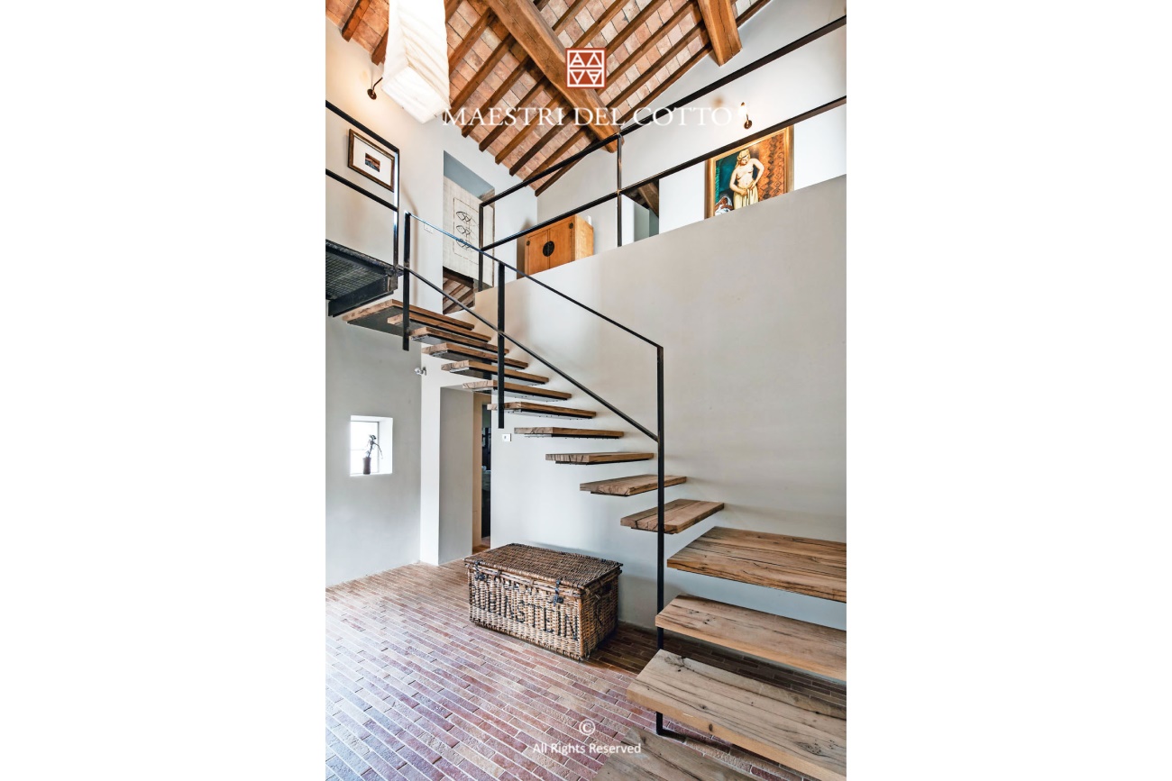 I due livelli sono collegati da una moderna scala in legno, e permette alla vista di unire differenti forme con differenti materiali.