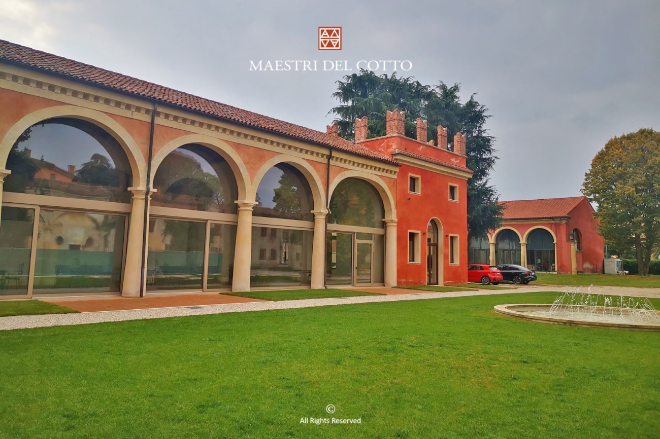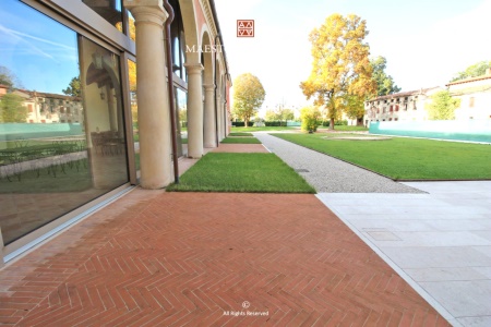 Il giardino, curato ma non artificiale, si estende come un tappeto verde punteggiato da alberi secolari e vialetti ghiaiosi. Il contrasto tra il verde vivo del prato, il colore caldo dei listelli in cotto rosato e le sfumature delle quadre interne crea una tavolozza di tonalità che rispecchia la bellezza naturale della campagna veneta. Non c’è dissonanza, ma un perfetto dialogo tra i materiali: il cotto fatto a mano, con le sue nuances terrose, assorbe e riflette i colori del paesaggio, rendendo la villa parte integrante dell’ambiente. È come se l’edificio fosse nato dal terreno stesso, costruito con la stessa materia della terra che lo circonda.