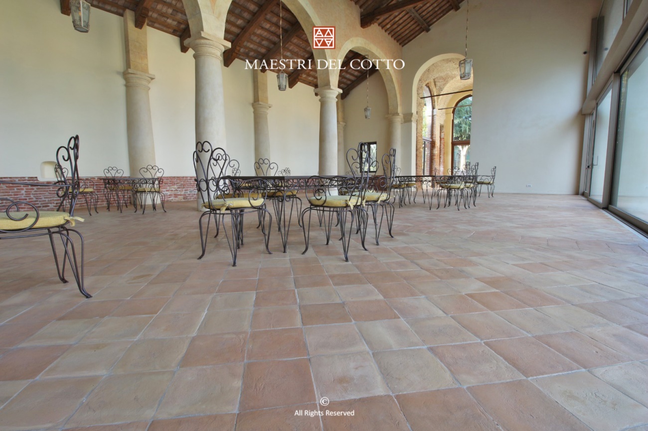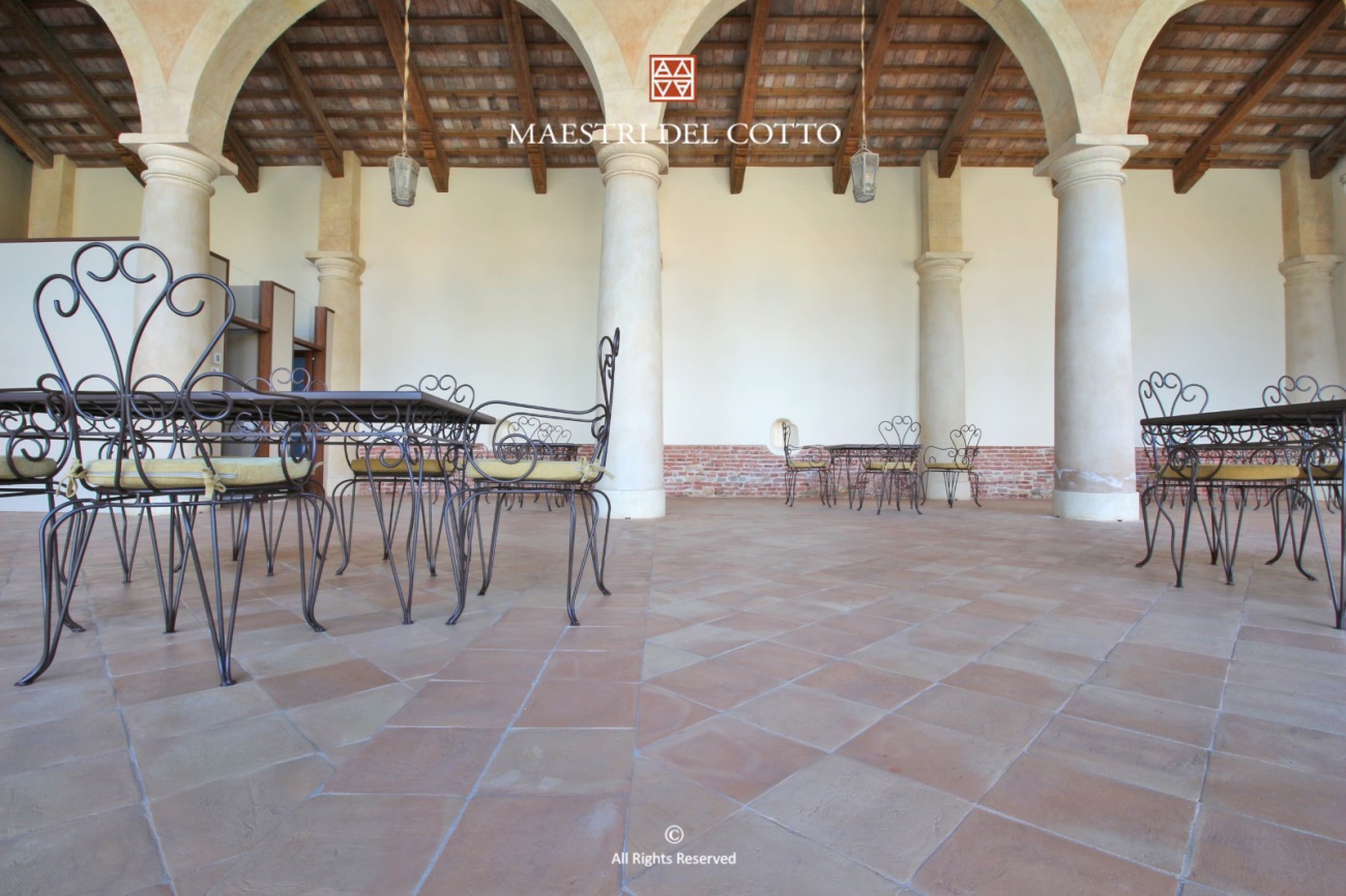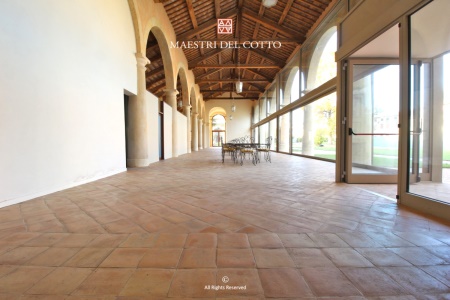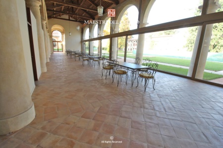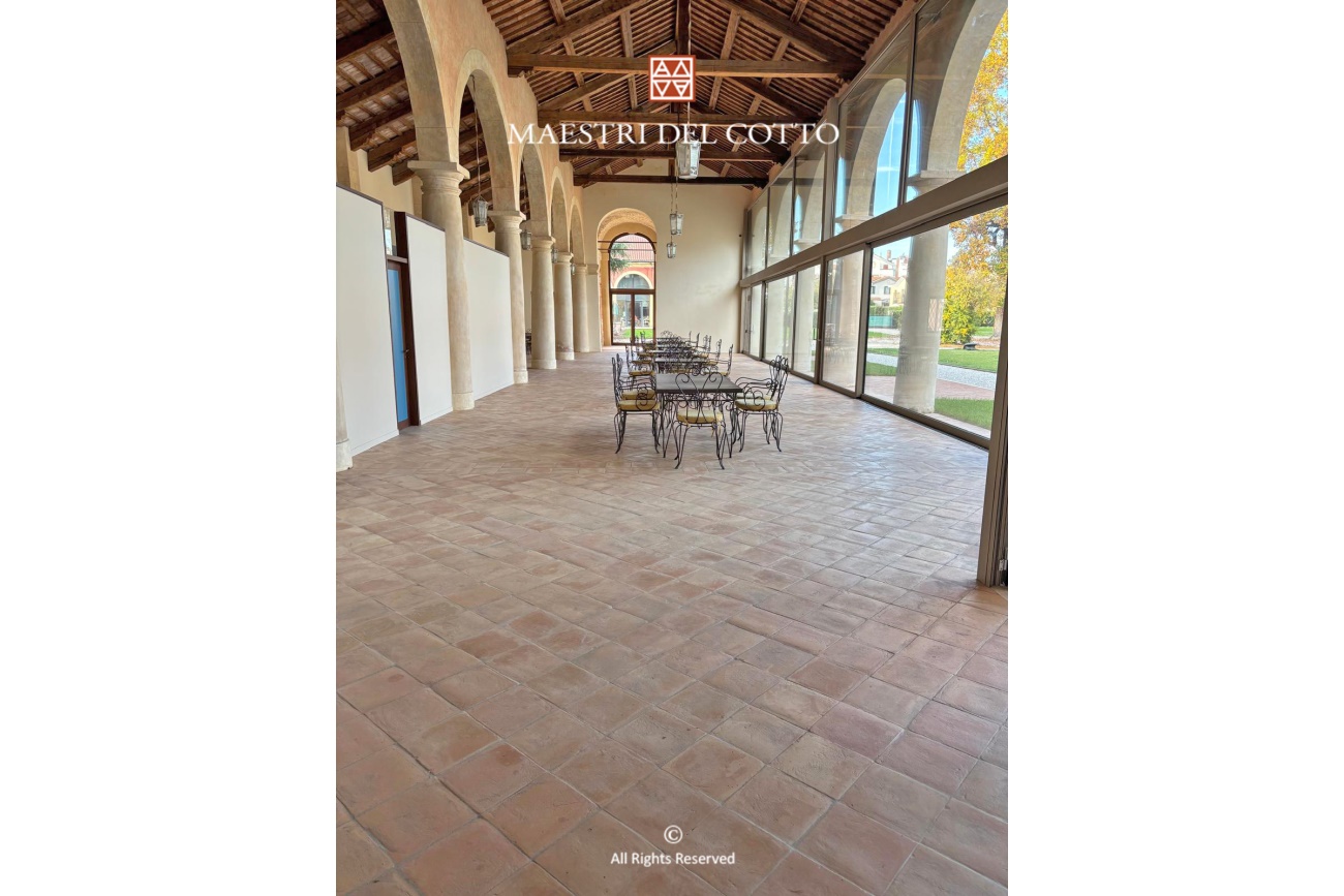All’interno della loggia, il pavimento in Quadre in Cotto Multicolor fatto a mano diventa il protagonista discreto ma essenziale di questo equilibrio estetico. Ogni manufatto, realizzato secondo tecniche artigianali tramandate nel tempo, presenta leggere imperfezioni e sfumature che raccontano la materia viva del cotto. Le tonalità variano con naturalezza dal rosso mattone al beige, fino a toccare punte di nocciola e ambra, restituendo una sensazione di calore e autenticità. Camminare su questo pavimento significa percepire la solidità della tradizione e il fascino dell’impermanenza: ogni segno, ogni piccola irregolarità riflette la mano dell’uomo e il tempo che vi ha posato sopra la sua impronta. In un contesto come quello di Villa Verlato, questo pavimento non è un semplice elemento decorativo, ma parte integrante del racconto architettonico della villa stessa, capace di legare l’interno con l’anima rurale e raffinata del territorio veneto.