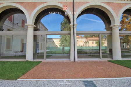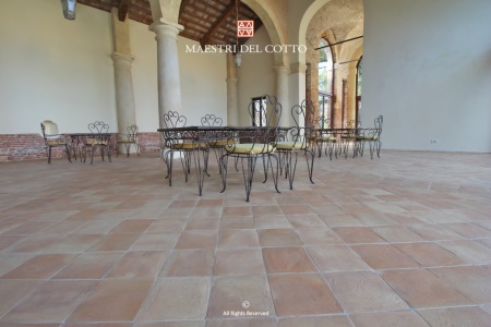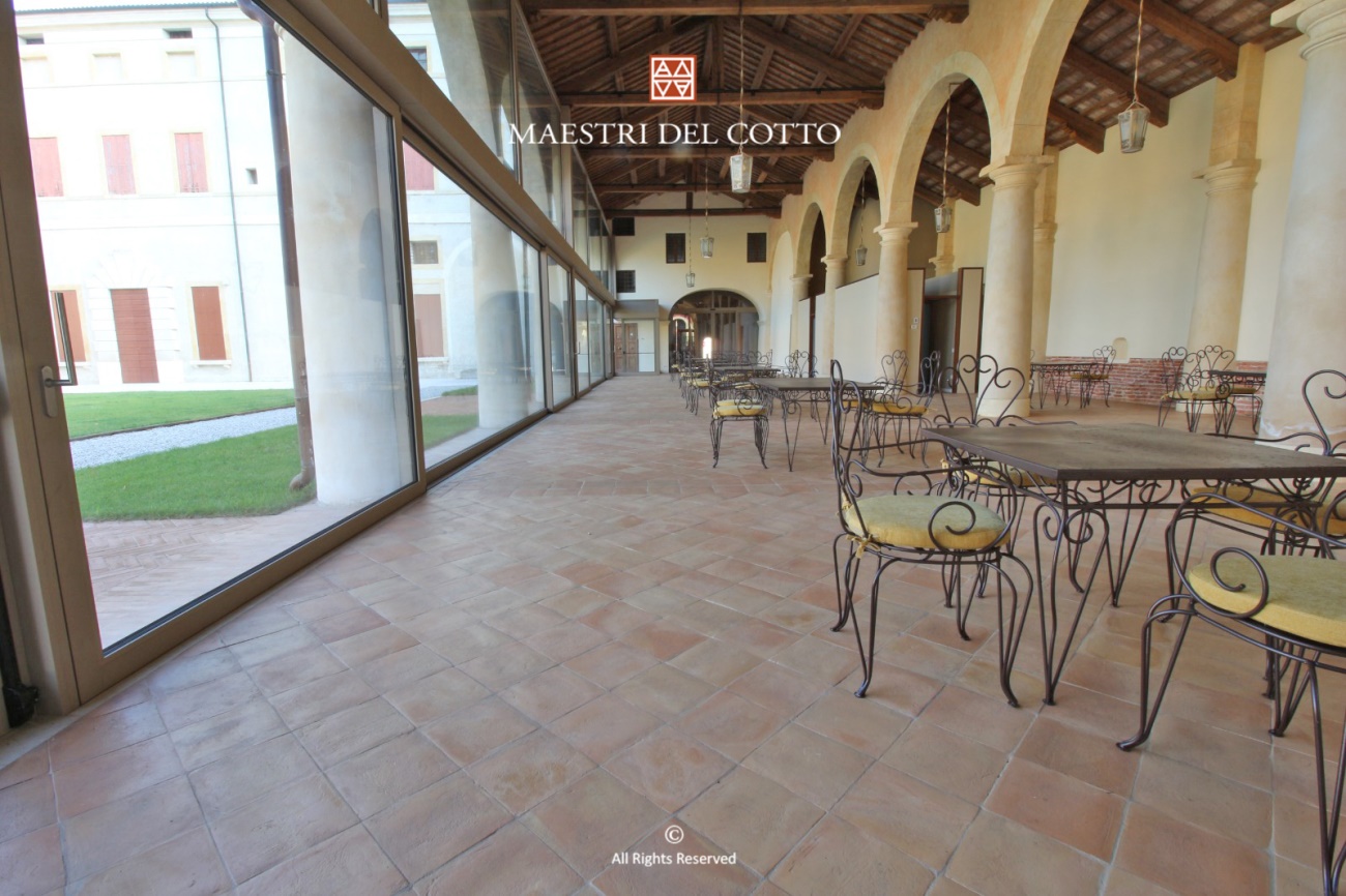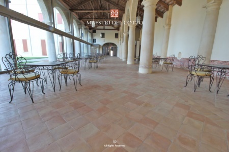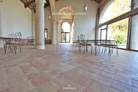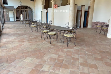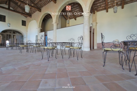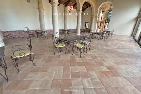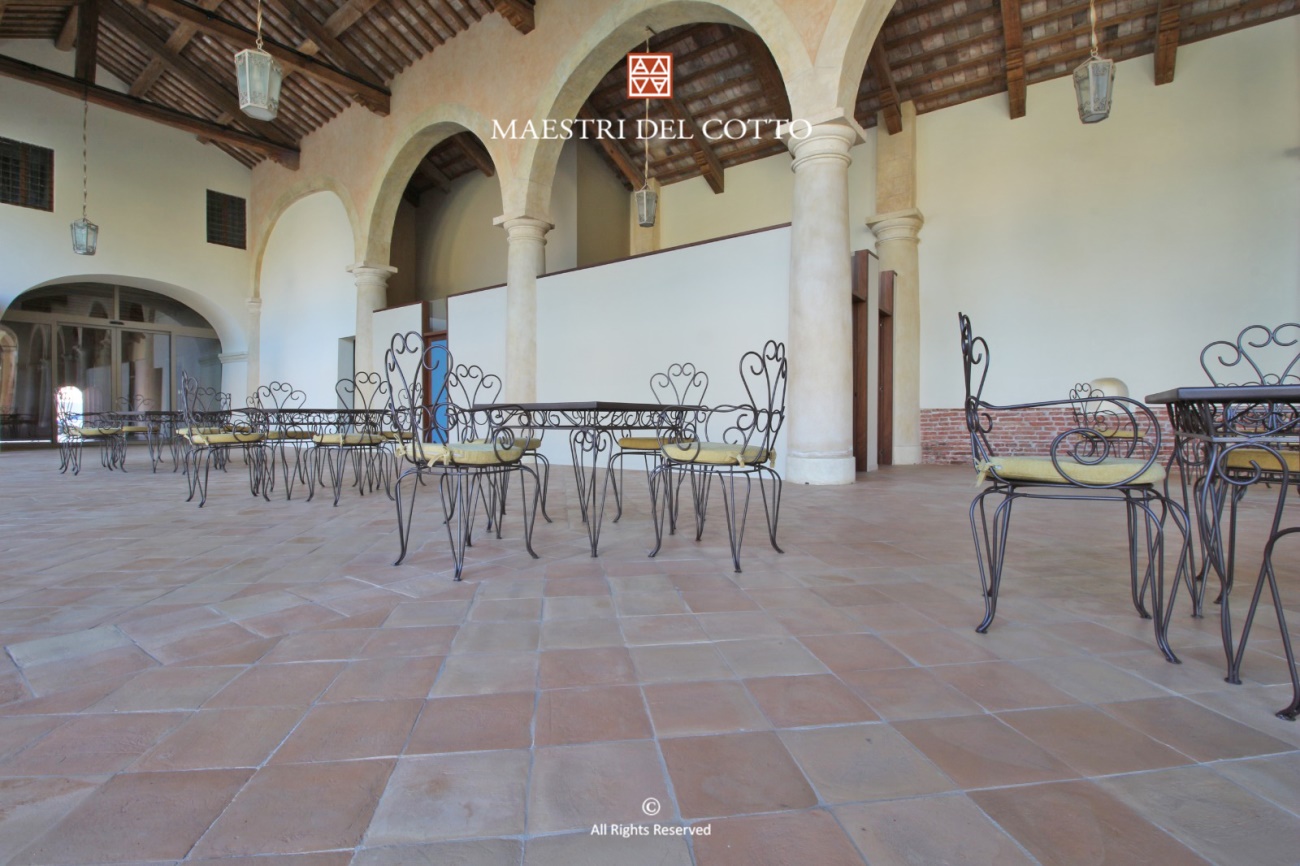 All’interno della loggia, il pavimento in Quadre in Cotto Multicolor fatto a mano diventa il protagonista discreto ma essenziale di questo equilibrio estetico. Ogni manufatto, realizzato secondo tecniche artigianali tramandate nel tempo, presenta leggere imperfezioni e sfumature che raccontano la materia viva del cotto. Le tonalità variano con naturalezza dal rosso mattone al beige, fino a toccare punte di nocciola e ambra, restituendo una sensazione di calore e autenticità. Camminare su questo pavimento significa percepire la solidità della tradizione e il fascino dell’impermanenza: ogni segno, ogni piccola irregolarità riflette la mano dell’uomo e il tempo che vi ha posato sopra la sua impronta. In un contesto come quello di Villa Verlato, questo pavimento non è un semplice elemento decorativo, ma parte integrante del racconto architettonico della villa stessa, capace di legare l’interno con l’anima rurale e raffinata del territorio veneto.