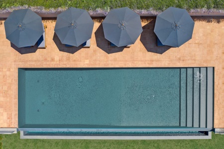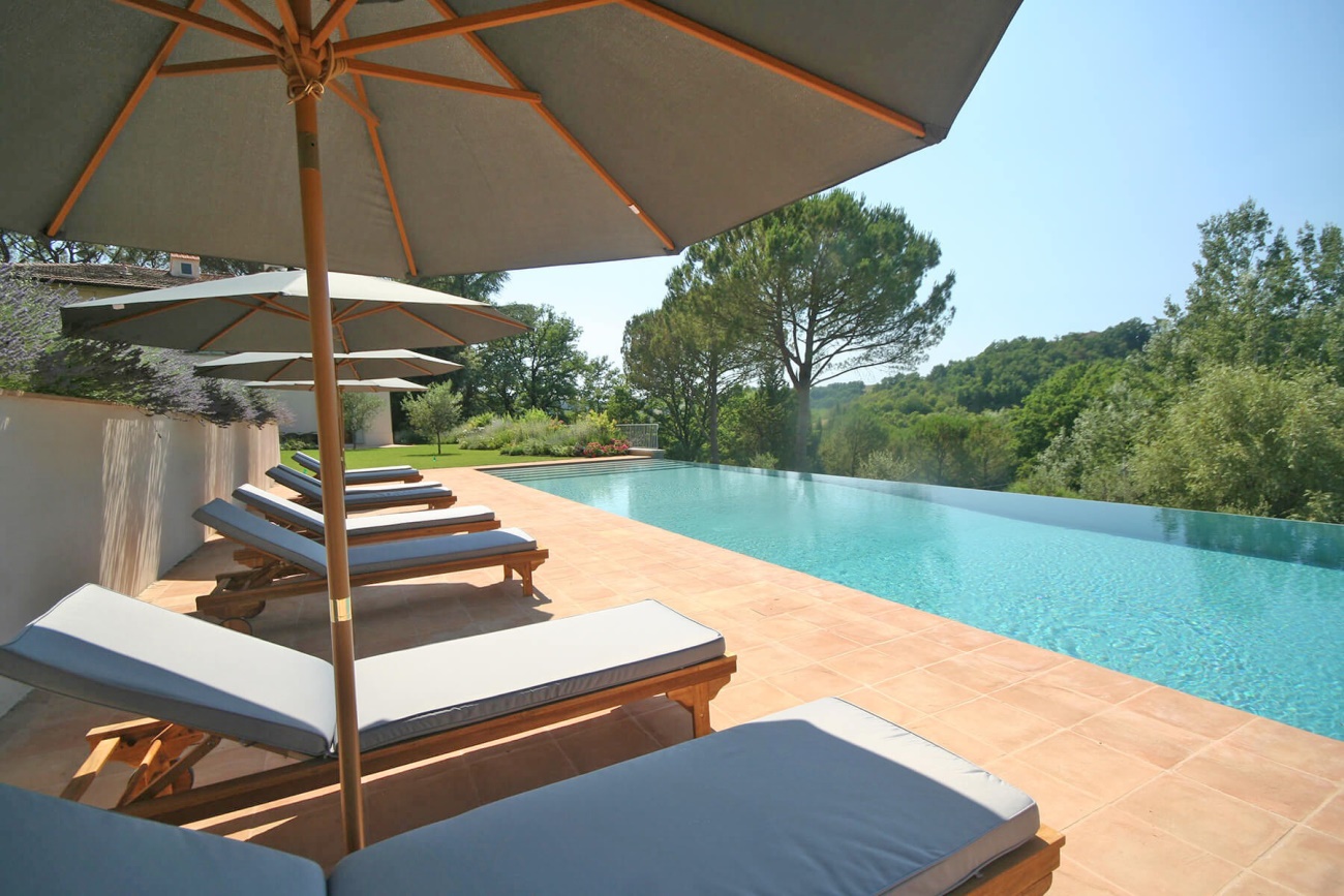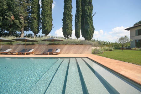 All’esterno, la magia continua. Il giardino curato, la vegetazione mediterranea e i cipressi che si stagliano verso il cielo creano una cornice scenografica intorno alla piscina. L’area solarium, con lettini in legno e ombrelloni, si affaccia su un panorama aperto, dove l’occhio si perde tra vigneti e dolci pendii. Anche qui, il cotto Terre Umbre è la scelta più giusta nella pavimentazione che circonda la piscina: resistente, antiscivolo, eppure raffinato, si integra con eleganza nella natura circostante. La sua finitura vissuta non solo è esteticamente accattivante, ma è anche pratica, perfetta per l’uso esterno sotto il sole toscano.