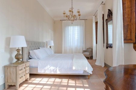 La zona notte prosegue sulla stessa linea estetica: la camera da letto principale è un esempio di come il lusso possa essere discreto e avvolgente. Il letto con testata imbottita, i comodini in legno naturale, le lampade dalle basi scolpite con dettagli dorati e le tende bianche che filtrano dolcemente la luce del sole, creano un’atmosfera da sogno. Anche qui, il pavimento in cotto Terre Umbre Vissuto gioca un ruolo fondamentale. La texture leggermente consumata dal tempo, ottenuta con tecniche artigianali di finitura, trasmette un senso di vissuto autentico, di storia, e dialoga alla perfezione con gli elementi d’arredo classici e con la luce calda che entra dalle finestre. Camminarvi scalzi sopra regala una sensazione tattile unica, naturale e confortevole, che contribuisce a rendere la villa un luogo da vivere a pieno, non solo da ammirare.