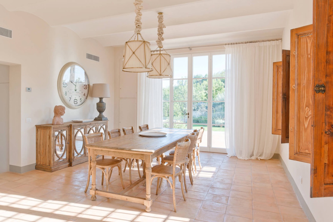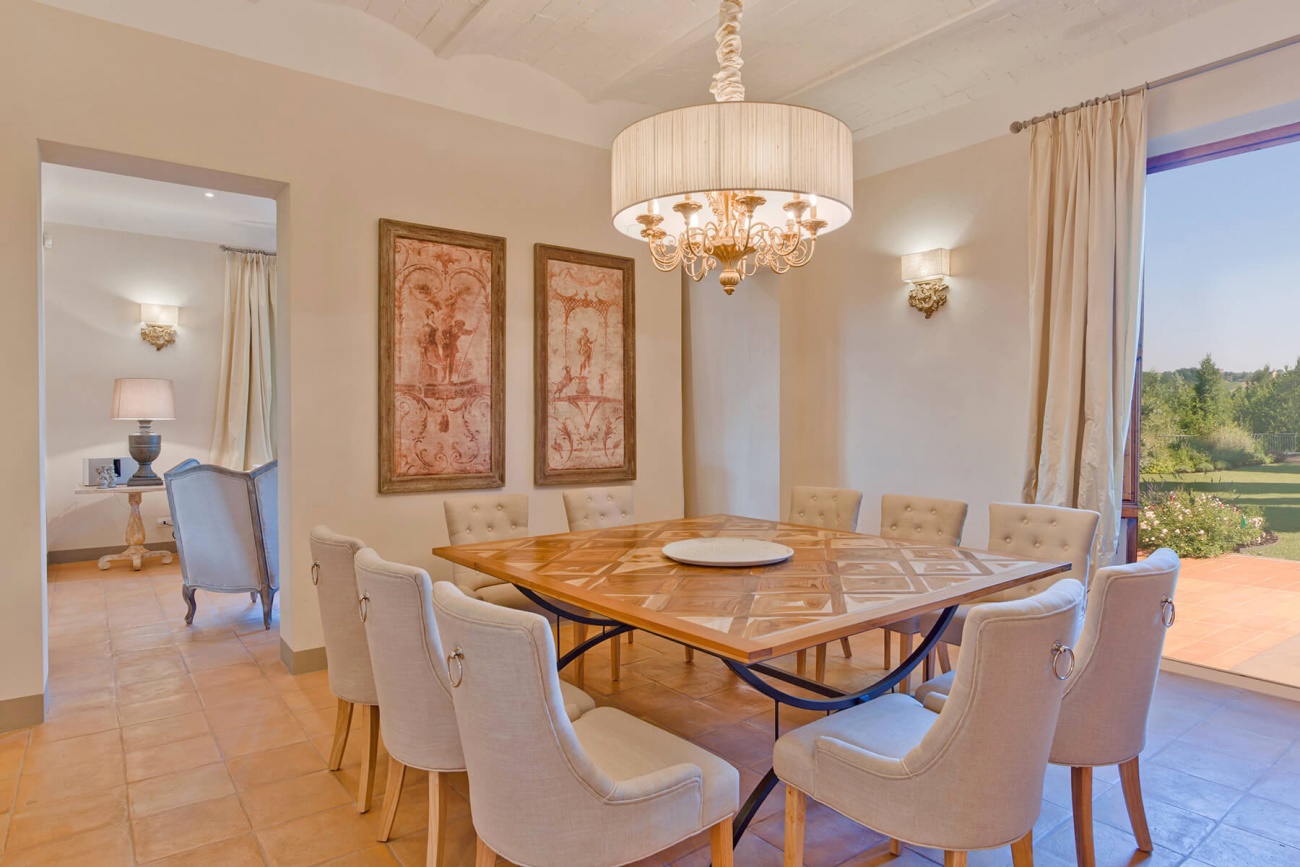 Appena si varca la soglia della villa, si è accolti in una sala da pranzo che emana una calda sensazione di autenticità. Gli arredi in legno naturale, le sedie impagliate in stile rustico, le grandi finestre a tutta altezza che aprono lo sguardo sul giardino e sulla campagna circostante, tutto concorre a creare un ambiente di quiete e bellezza naturale. In questa atmosfera il pavimento in cotto Terre Umbre Vissuto a catturare lo sguardo: le sue tonalità calde, che vanno dall’ocra alla terracotta, con sfumature leggere e imperfezioni volute, richiamano la tradizione delle antiche case rurali toscane. Il formato quadra, con le sue linee ben definite ma morbide alla vista, dona un senso di ordine e spaziosità, valorizzando l’ampiezza e la luminosità degli spazi.
